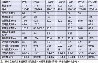 物性:乳白色或微黃色透明到不透明角質狀結晶性聚合物;可自由著色,韌性、耐磨性、自潤滑性好、剛性小、耐低溫,耐細菌、能慢燃,離火慢熄,有滴落、起泡現象。最高使用溫度可達180℃,加抗沖改性劑后會降至160℃;用15%~50%玻纖增強,可提高至199℃,無機填充PA能提高其熱變形溫度。
