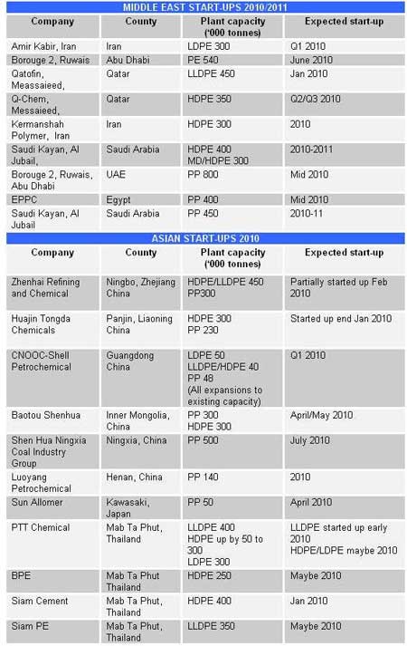成本低廉是中東得天獨厚的優勢,而中東的生產制造商業表示2010年預計將增加PE產能220萬噸/年,PP產能165萬噸/年。然而,這些產能對市場的影響預計將到2010年年底或者2011年年初才會浮出水面。