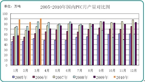 伴隨著世界經濟逐步走出危機的陰霾,下游需求也在緩慢恢復,但從PVC市場的實際銷售情況和價格走勢觀察,下游需求恢復的速度相對比較緩慢。然而自2009年開始,國內PVC的產量卻是在逐步恢復,尤其進入2010年之后,PVC國產量是屢創新高,根據中國石油和化工工業協會的統計數據顯示,2010年前三個月國內PVC的總產量分別在88.8萬、83.7萬和90.6萬噸,拋開二月份的春節因素,一月和三月的產量均創十年來PVC國產量的新高。