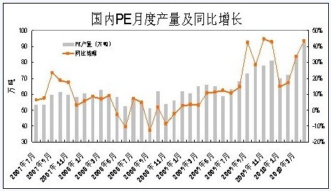 2010年4月國內(nèi)PE產(chǎn)量為92.3萬噸,較去年同期(64.4萬噸)增加27.9萬噸,增幅為43.3%。1-4月份累計產(chǎn)量324.8萬噸,同比去年(348.3萬噸)增加76.5萬噸,增幅為30.8%。從數(shù)據(jù)中可以看到,3、4月份PE產(chǎn)量猛增,需求呈現(xiàn)疲弱狀態(tài),新舊庫存承壓塑料價格,而6、7月份為塑料消費(fèi)淡季,新增產(chǎn)能短期消化難度較大。