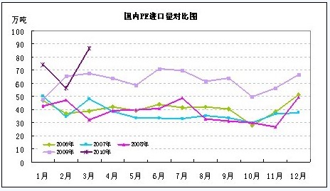 2010年3月PE總進(jìn)口86.58噸,環(huán)比增加53.59%,同比上年3月份(67.37萬噸)增漲28.51%,其中,LDPE進(jìn)口22.53萬噸,HDPE進(jìn)口36.74萬噸,LLDPE進(jìn)口27.31萬噸。數(shù)據(jù)表明雖然國內(nèi)PE產(chǎn)量單月創(chuàng)出歷史新高,但進(jìn)口量并未出現(xiàn)回落,對外依存度仍在50%附近,是需求增加了?筆者認(rèn)為主要是因為中東地區(qū)擴(kuò)產(chǎn),增加出口所致,這勢必導(dǎo)致國內(nèi)PE市場供應(yīng)壓力累計,而第一季度銷售旺季卻略顯平淡.在高產(chǎn)、高進(jìn)口、低需求使PE價格受到抑制,而4月份的產(chǎn)量繼續(xù)攀升,給塑料價格釋放性下跌奠定了基礎(chǔ),預(yù)計4月份PE進(jìn)口量仍將保持80萬噸以上,而近期LLDPE期現(xiàn)價格的急速下跌已經(jīng)兌現(xiàn)了大部分利空因素,但第二季度LLDPE市場難言樂觀。