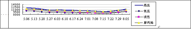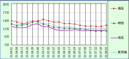 A、聚乙烯(PE):受石化企業大幅漲價和外盤穩步攀升的驅動,上半周市場繼續升溫,價格抬升了400-500元,其中線性、高壓市場升幅偏大,市場成交火爆;進入下半周,市場獲利了結氣氛和高價抵觸情緒的顯現,促使國內市場行情降溫,高端成交遇阻。