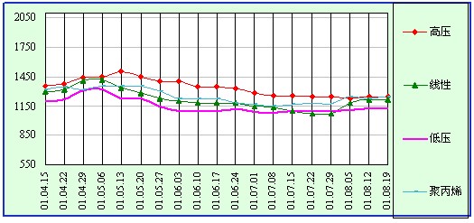 A、聚乙烯(PE):受市場需求萎縮和和資源供應充裕的拖累,本周國內市場行情延續上周抑勢,價格續跌了100-200元,其中高壓聚乙烯跌幅偏大,市場成交疲滯。