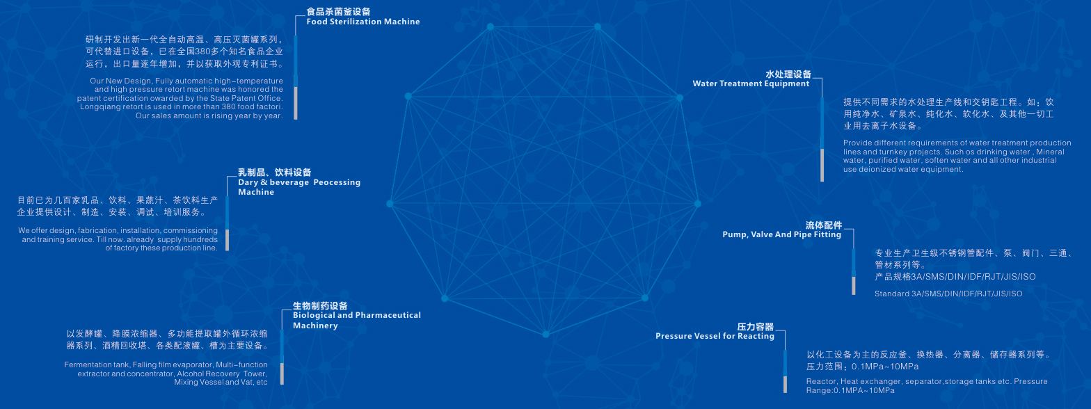杀菌锅、高剪切乳化机、灭菌机、制冷罐、不锈钢搅拌罐、乳化罐、果汁饮料生产线、浓缩提取设备、提取浓缩设备等产品在国内各食品制药企业正常运行中,为用户提供了完善的服务,为他们的生产经营和产品质量提供可靠性保证,受到用户的一致好评。